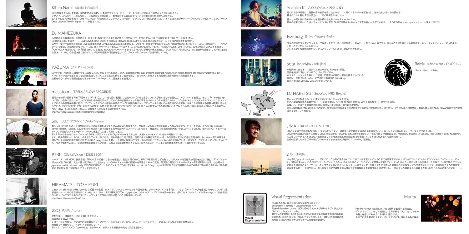 Kihira Naoki (Social Infection) / DJ MAMEZUKA / KAZUMA (D.H.P / nebula) / masato.m (TREKs / FLOW RECORDS) / Shu (ELECTRONYX / Digital Vision) / PTBK (Digital Vision / DESSEBON) / HIRAMATSU TOSHIYUKI / 23Q (OWL / torus) / Yoshizo K. (A.O.Z.O.R.A. / 天空の宴 / Psy-borg (Shiva-Yusuke -Noli) / sota (pride&joy / rokujian) / RaMu (MindWarp / ODORIBA) / DJ HARETSU (Superbad MIDI Breaks) / JIMA (TREKS / INSP SOUND) / dsk (TREKs)