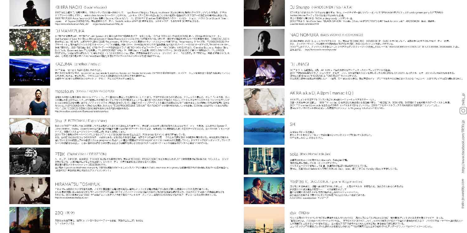 KIHIRA NAOKI (Social Infection) / DJ MAMEZUKA / KAZUMA (tonefloat / nebula) / masato.m (TREKs / FLOW RECORDS) / Shu (ELECTRONYX / Digital Vision) / NAO NOMURA (BASS WORKS RECORDINGS) / SHI / HIRAMATSU TOSHIYUKI / DJ Shungo (HANDSOMEN / feb / A.T.A) / DJ UNAGI / AKIRA a.k.a Dj A.Bpm (maniac I.Q) / PTBK (Digital Vision / DESSEBON) / 23Q (天空) / Yoshizo K. (A.O.Z.O.R.A. / ground Re:generation) / dsk (TREKs)